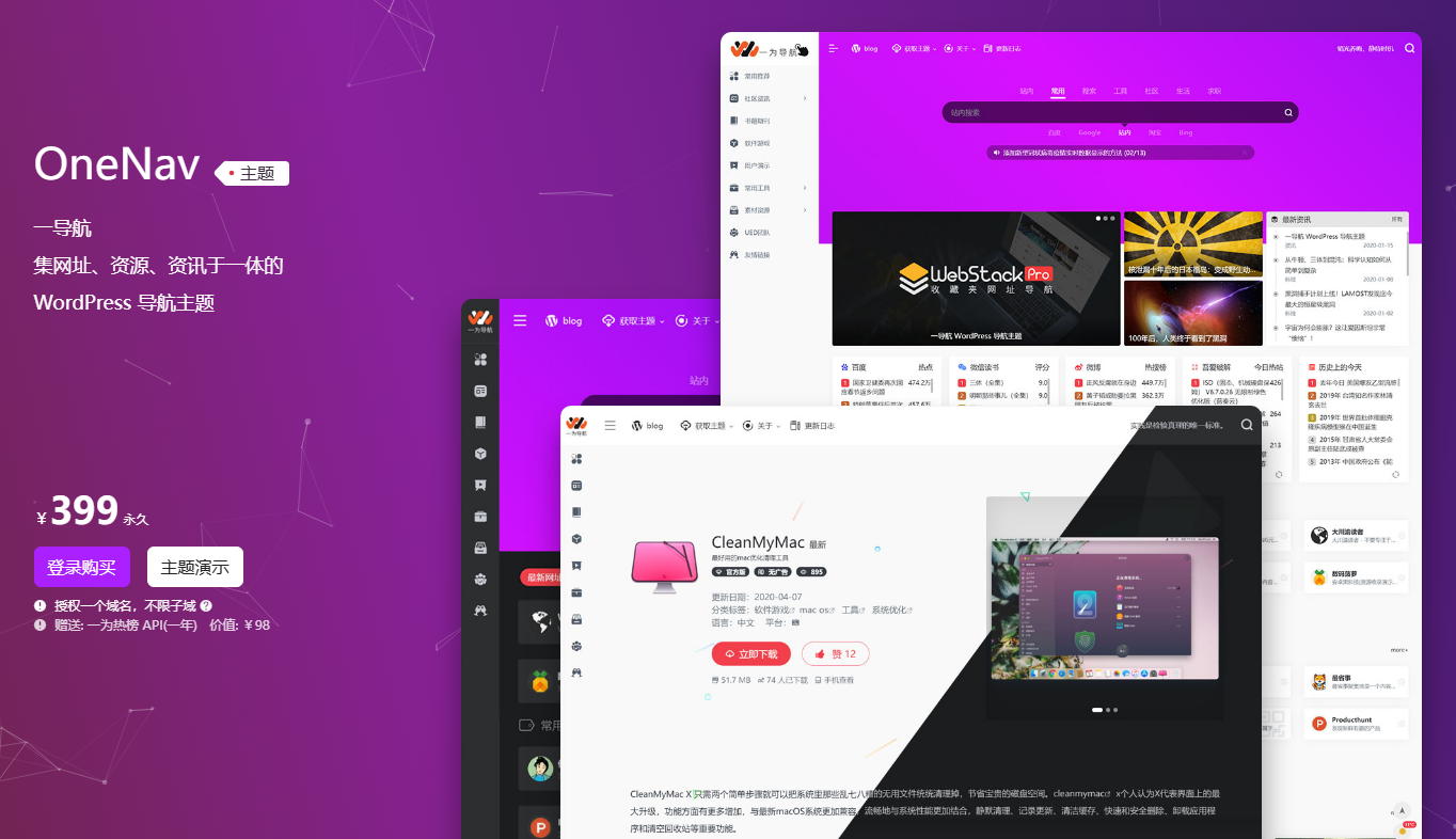 OneNav 是由 iotheme 提供的一款专业 WordPress 主题,专注于提升网站导航体验。它可以集网址、app、资源、书籍、影视等内容导航于一体,各模块可单独使用,互不影响。OneNav主题的发展历程可见其版本更新记录,不断优化改进以满足用户的需求